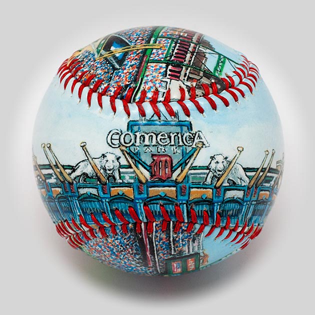 This printed baseball has a detailed painting of Comerica Park printed on it; current stadium of the Detroit Tigers. One panel of the baseball has the inside field view, the other panel has the outside view of the stadium.