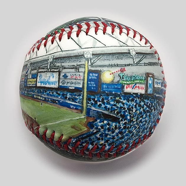 This printed baseball has a detailed painting of Tropicana Field printed on it. One panel of the baseball has inside field view of the stadium, including billboards and stadium seats painted in full detail. Other panel of baseball has view of outside stadium where the name Tropicana Field is located, exactly as it is shown on the real building.