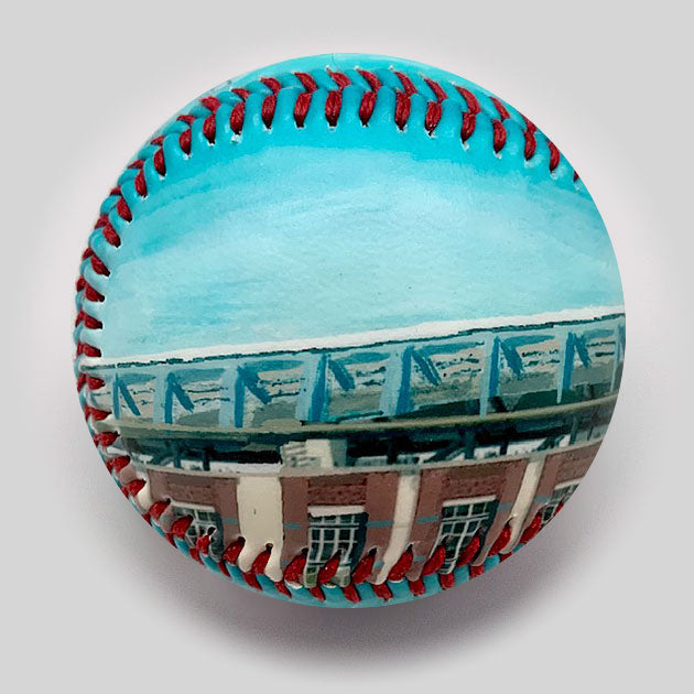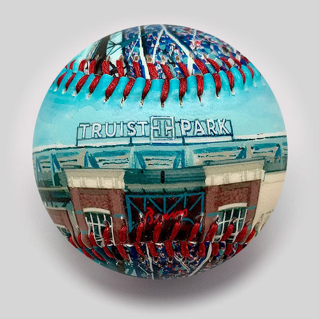 This printed baseball has a detailed painting of Truist Park printed on it. One panel of the baseball has inside field view of the stadium, including billboards and stadium seats painted in full detail. Other panel of baseball has view of outside stadium.